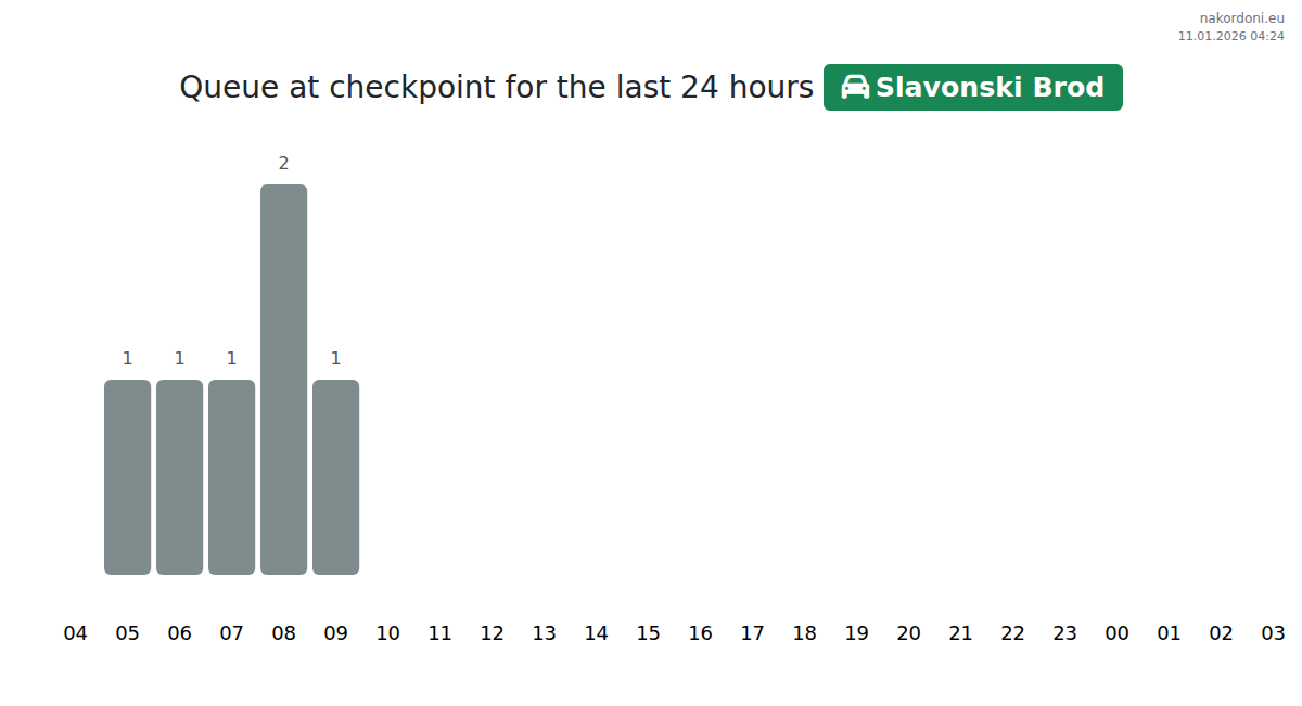 Wait times at Slavonski Brod are between 71-77 minutes. Avoid peak hours at 23:00, 06:00, and 00:00; instead, aim for 01:00-03:00, which are currently the best times for a quick crossing.