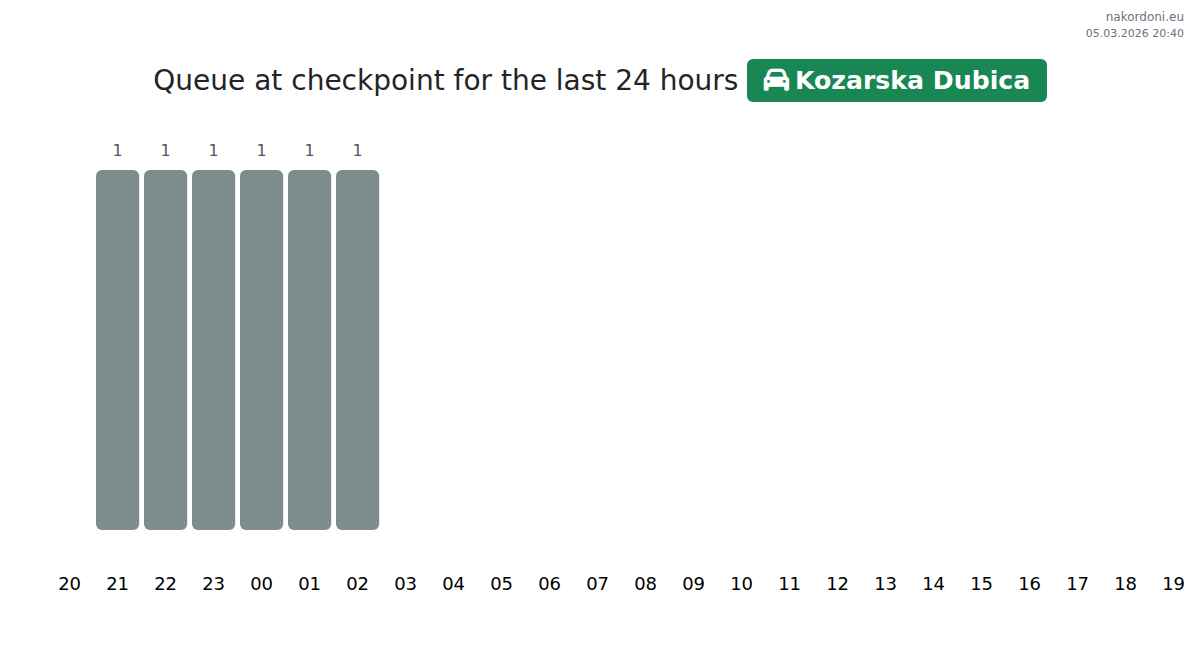 Plan your trips in advance using up-to-date border queue information at the Kozarska Dubica - passenger car checkpoint to make your crossing fast and convenient. Pay special attention to these hours to avoid peak times and reduce waiting times.