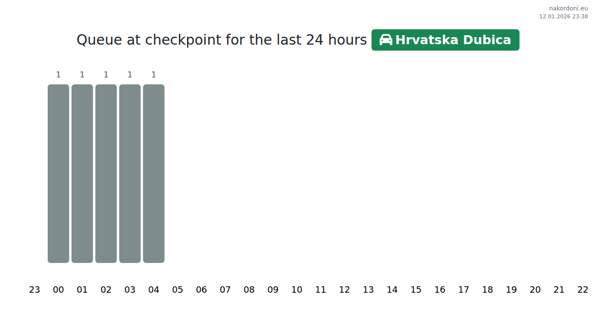 At Hrvatska Dubica, the estimated wait time is 71-125 minutes. Avoid peak hours at 08:00, 11:00, and 15:00 to minimize delays. The best times for crossing are 01:00, 02:00, and 03:00.