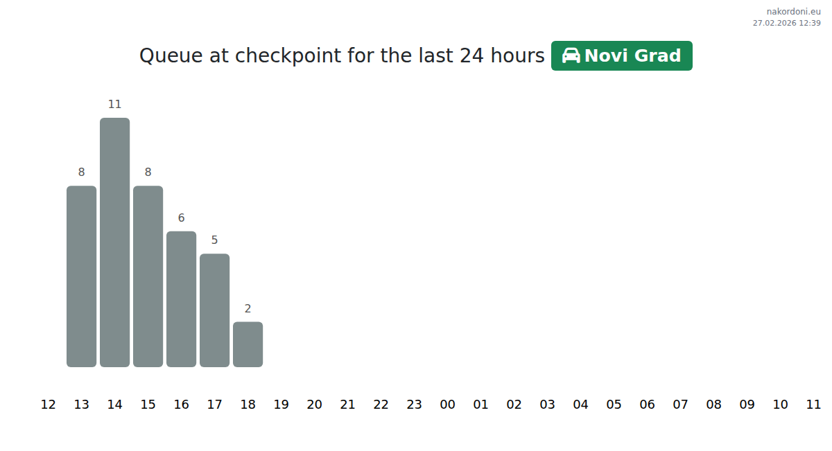 At the Novi Grad checkpoint, the expected wait time is 71-107 minutes. We recommend avoiding peak hours at 07:00, 09:00, and 10:00. The best times to cross are 16:00, 18:00, or 19:00, when the queues are shortest.