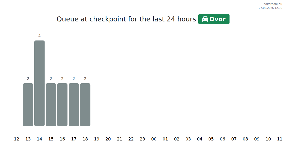 Expected wait times at Dvor checkpoint for passenger cars range from 71 to 89 minutes. We recommend avoiding peak hours at 11:00, 07:00, and 12:00. The best times for crossing are 17:00, 18:00, and 19:00.