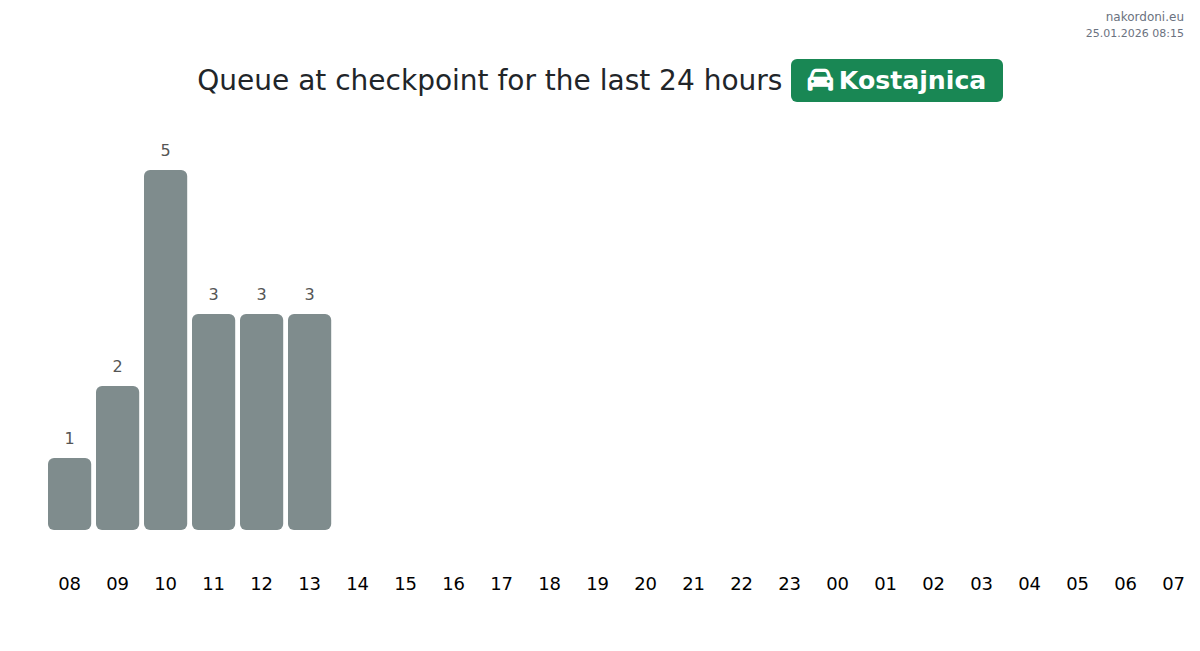 The wait time forecast for the Kostajnica checkpoint is 71-95 minutes. We recommend avoiding peak hours (08:00, 12:00, 13:00) and planning your trip for 02:00, 06:00, or 18:00 for the fastest crossing.