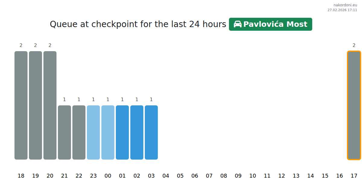 At Pavlovića Most, wait times for passenger cars range from 71 to 83 minutes. Peak congestion occurs at 11:00, 15:00, and 19:00, so it is best to avoid these hours. For a faster crossing, aim for 22:00, 23:00, or 00:00.