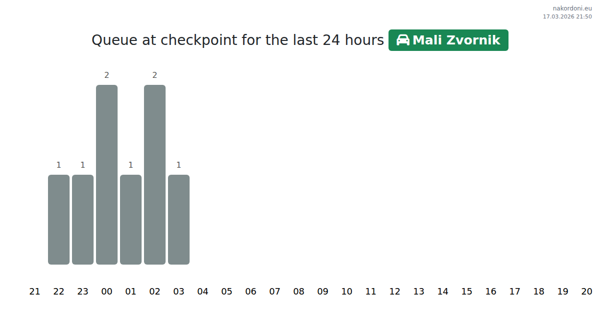 At Mali Zvornik, wait times for passenger cars range from 71 to 125 minutes. Avoid peak hours at 12:00, 14:00, and 15:00 to save time. The best hours to cross are 20:00, 21:00, and 23:00 when queues are shortest.