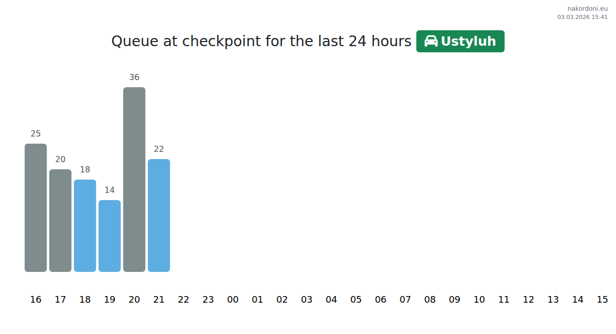 The queue forecast for passenger cars at Ustyluh ranges from 15 to 2015 minutes. Avoid peak hours at 14:00, 18:00, and 07:00 for a smoother trip. The best times to cross are currently 13:00, 16:00, and 17:00.
