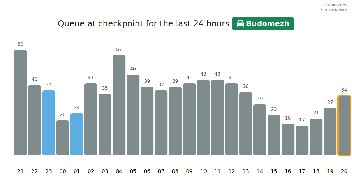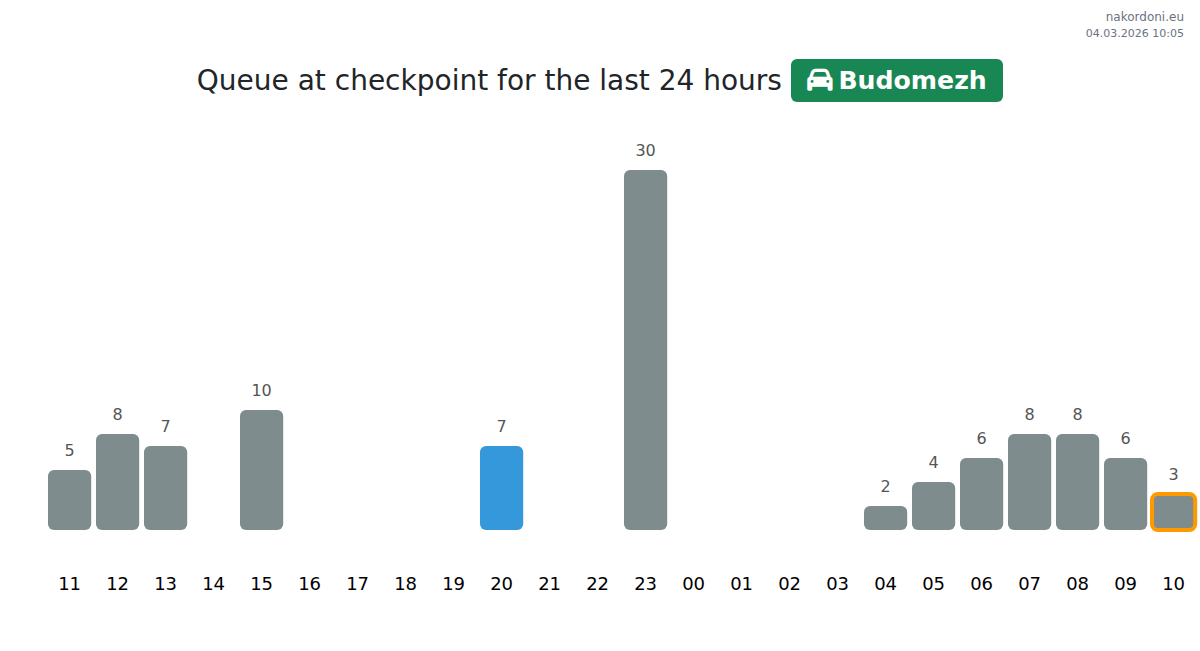 Plan your trips in advance using up-to-date border queue information at the Budomezh - passenger car TaxFREE (Red line) checkpoint to make your crossing fast and convenient. Pay special attention to these hours to avoid peak times and reduce waiting times.