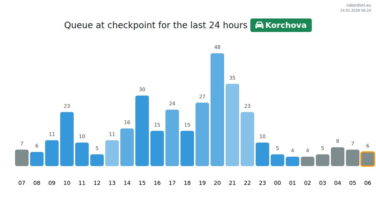 Plan your trips in advance using up-to-date border queue information at the Korchova - passenger car checkpoint to make your crossing fast and convenient. Pay special attention to these hours to avoid peak times and reduce waiting times.