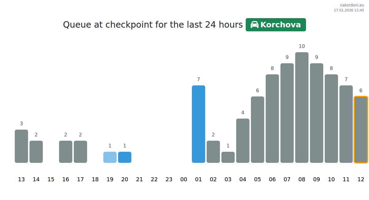 Plan your trips in advance using up-to-date border queue information at the Korchova - passenger car TaxFREE (Red line) checkpoint to make your crossing fast and convenient. Pay special attention to these hours to avoid peak times and reduce waiting times.