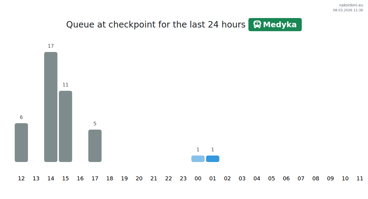 At the Medyka checkpoint, bus wait times range from 15 to 1215 minutes. Avoid peak hours at 10:00, 00:00, and 01:00 for faster processing. The best times to cross are 11:00, 15:00, and 19:00 when queues are shortest.