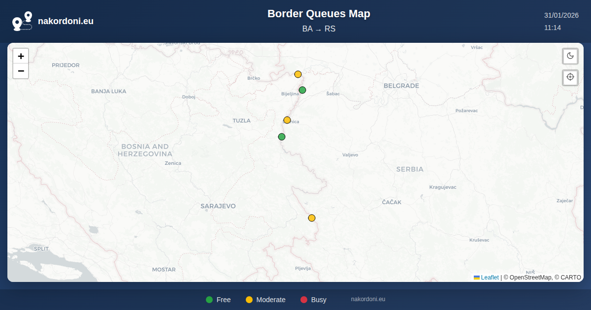 Interactive Bosnia and Herzegovina — Serbia Border Map with Real-Time Queues, Forecast, and Crossing Status