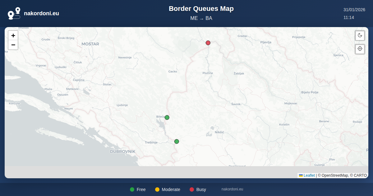 Interactive Montenegro — Bosnia and Herzegovina Border Map with Real-Time Queues, Forecast, and Crossing Status