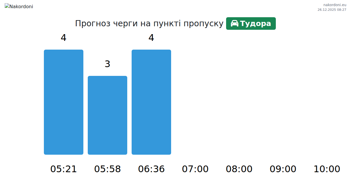 Для уникнення довгих черг на кордоні на пункті пропуску Тудора - легковий автомобіль, рекомендуємо планувати перетин кордону в години найменшого навантаження. Згідно з даними за минулу добу, найменша кількість автомобілів спостерігалася між 8:00 та 12:00 годинами. Це ідеальний час для перетину кордону, щоб зекономити час і уникнути затримок.