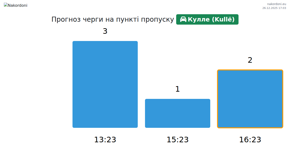 Для уникнення довгих черг на кордоні на пункті пропуску Кулле (Kullë) - авто, рекомендуємо планувати перетин кордону в години найменшого навантаження. Згідно з даними за минулу добу, найменша кількість автомобілів спостерігалася між :00 та 2:00 годинами. Це ідеальний час для перетину кордону, щоб зекономити час і уникнути затримок.