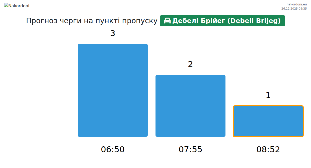 Для уникнення довгих черг на кордоні на пункті пропуску Дебелі Брійег (Debeli Brijeg) - легковий автомобіль, рекомендуємо планувати перетин кордону в години найменшого навантаження. Згідно з даними за минулу добу, найменша кількість автомобілів спостерігалася між 4:00 та 7:00 годинами. Це ідеальний час для перетину кордону, щоб зекономити час і уникнути затримок.