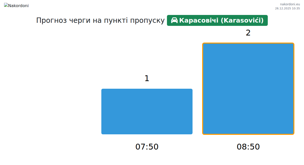 Плануйте свої поїздки заздалегідь, використовуючи актуальну інформацію про черги на кордоні на пункті пропуску Карасовічі (Karasovići) - легковий автомобіль, щоб зробити ваш перетин швидким і зручним. Приділіть особливу увагу цим годинам, щоб уникнути пікового навантаження і зменшити час очікування.