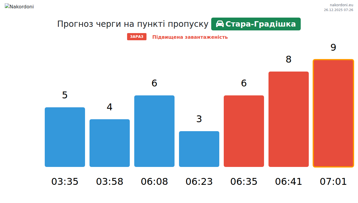 Для уникнення довгих черг на кордоні на пункті пропуску Стара-Градішка - легковий автомобіль, рекомендуємо планувати перетин кордону в години найменшого навантаження. Згідно з даними за минулу добу, найменша кількість автомобілів спостерігалася між 1:00 та 4:00 годинами. Це ідеальний час для перетину кордону, щоб зекономити час і уникнути затримок.