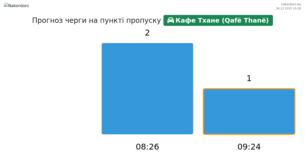 Для уникнення довгих черг на кордоні на пункті пропуску Кафе Тхане (Qafë Thanë) - легковий автомобіль, рекомендуємо планувати перетин кордону в години найменшого навантаження. Згідно з даними за минулу добу, найменша кількість автомобілів спостерігалася між 1:00 та 4:00 годинами. Це ідеальний час для перетину кордону, щоб зекономити час і уникнути затримок.