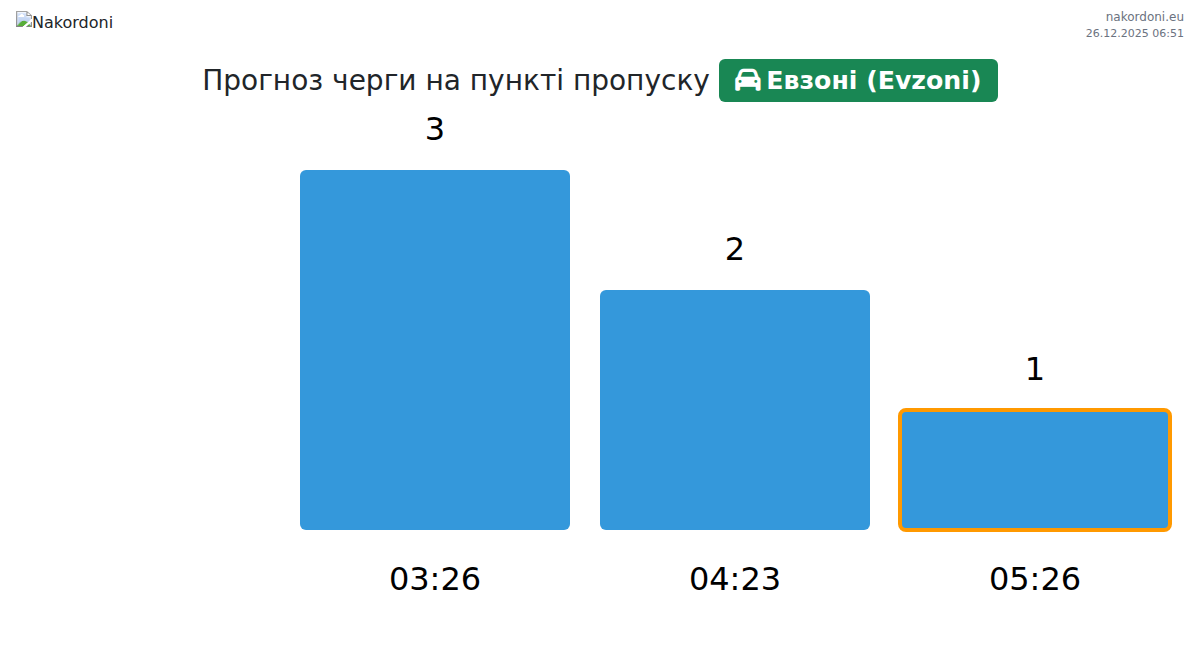 За період 25.12.2025 з 00:00 по 23:59 на кордоні на пункті пропуску Евзоні (Evzoni) - легковий автомобіль були зафіксовані наступні ключові моменти: