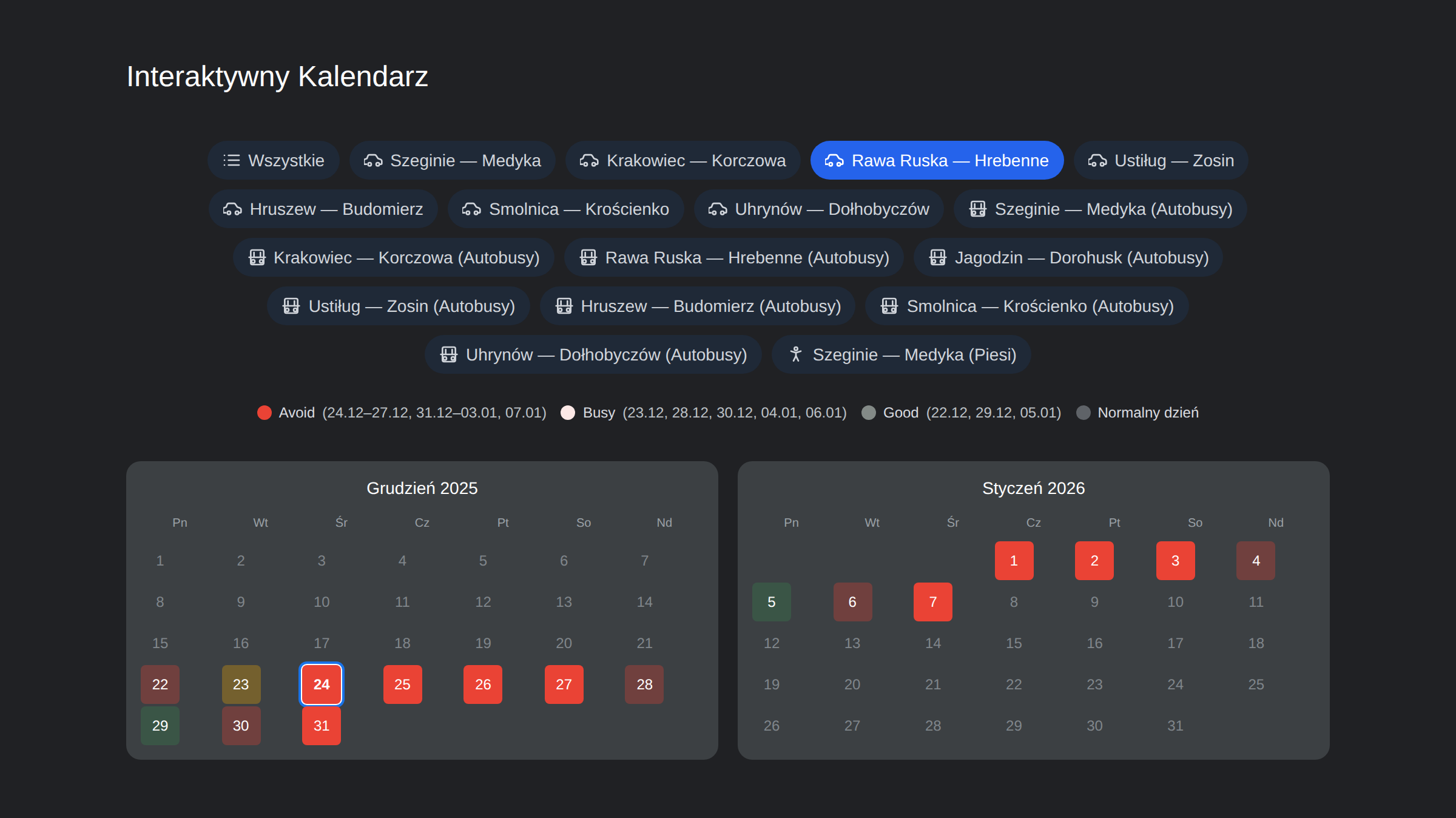 Cel tego przewodnika — pomóc wybrać optymalne dni i godziny przekroczenia granicy, aby zminimalizować oczekiwanie. Na tej stronie znajdziesz interaktywny kalendarz prognoz kolejek, dane w czasie rzeczywistym z 16 przejść granicznych, analizę ruchu godzinowego i rekomendacje ekspertów.