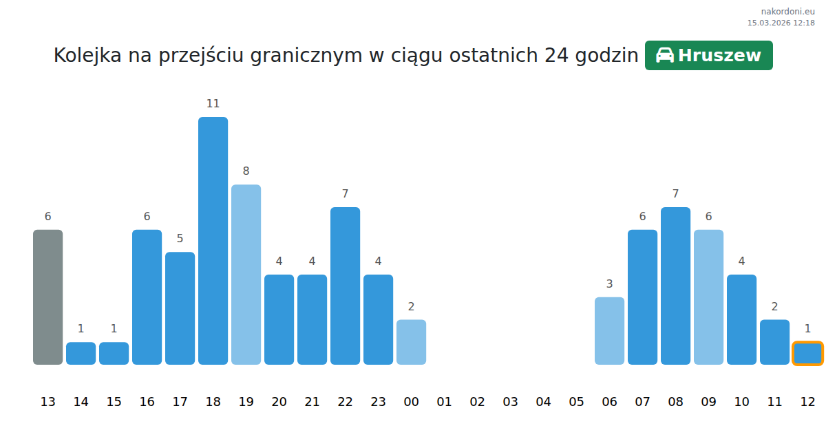 Czas oczekiwania dla aut na przejściu Hruszew wynosi 15-63 min. Najlepszy czas na przekroczenie granicy to 00:00, 05:00 i 06:00. Unikaj godzin szczytu (11:00, 13:00, 14:00), aby uniknąć najдłuższych kolejek.