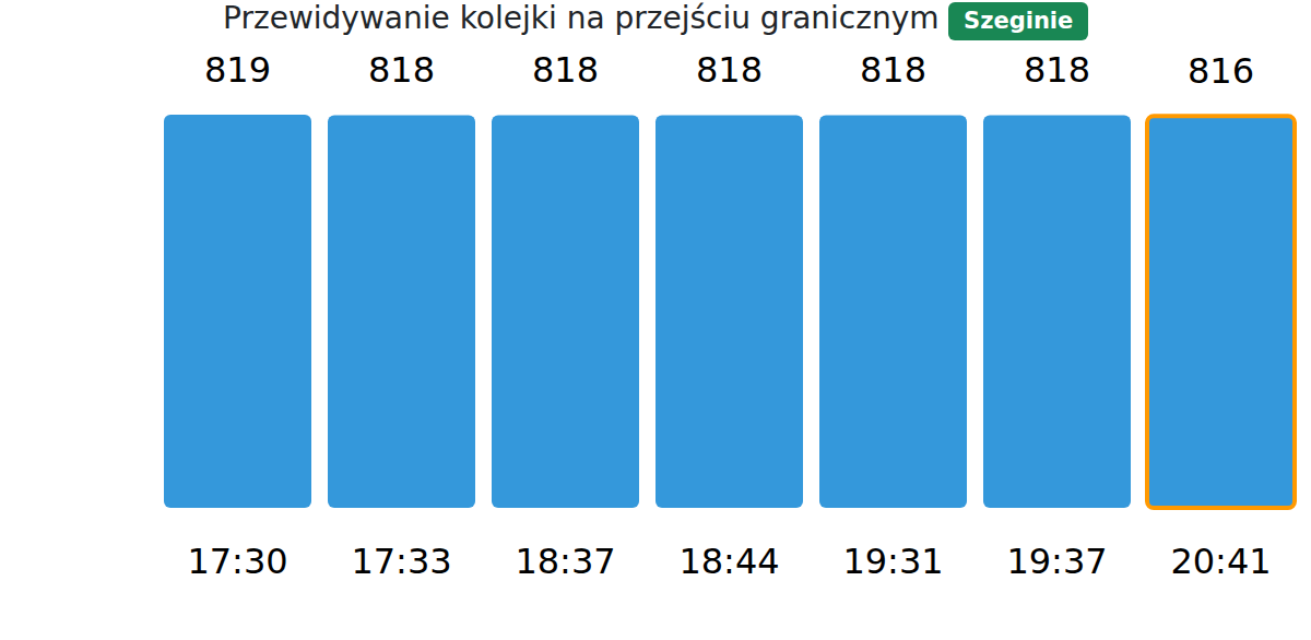 Planuj swoje podróże z wyprzedzeniem, korzystając z aktualnych informacji o kolejkach na granicy na punkcie kontrolnym Szeginie - transport ciężarowy, aby przejazd był szybki i wygodny. Zwróć szczególną uwagę na te godziny, aby uniknąć szczytowego natężenia i skrócić czas oczekiwania.