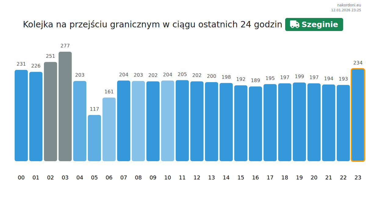 Aby uniknąć długich kolejek na granicy na punkcie kontrolnym Szeginie - transport ciężarowy, zaleca się planowanie przekraczania granicy w godzinach najmniejszego obciążenia. Według danych z ostatniego dnia, najmniejsza liczba pojazdów była obserwowana między 4:00 a 7:00 godziną. To idealny czas na przekroczenie granicy, oszczędzając czas i unikając opóźnień.