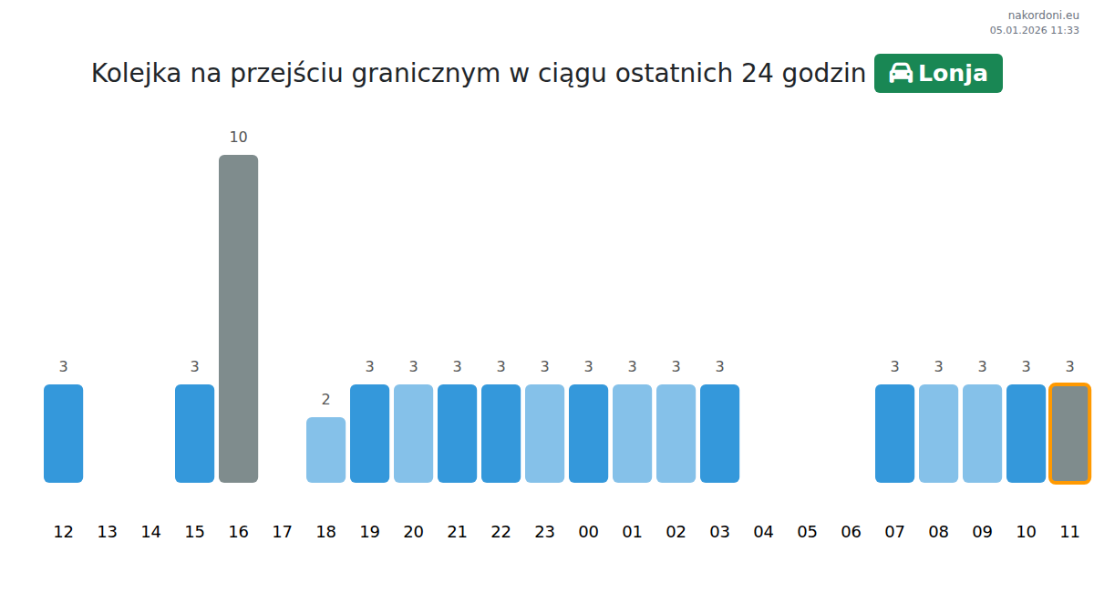 Aby uniknąć długich kolejek na granicy na punkcie kontrolnym Lonja - samochód osobowy, zaleca się planowanie przekraczania granicy w godzinach najmniejszego obciążenia. Według danych z ostatniego dnia, najmniejsza liczba pojazdów była obserwowana między :00 a 3:00 godziną. To idealny czas na przekroczenie granicy, oszczędzając czas i unikając opóźnień.