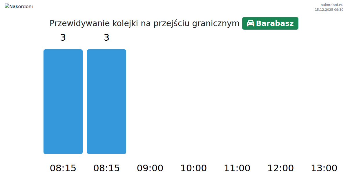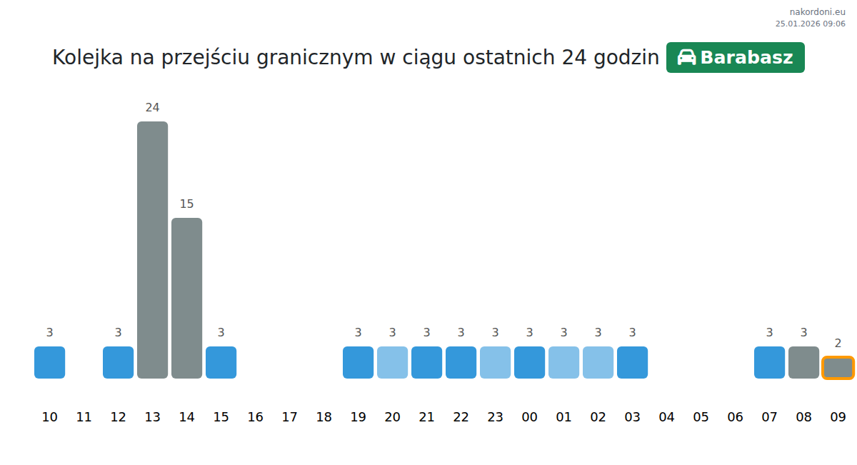 Planuj swoje podróże z wyprzedzeniem, korzystając z aktualnych informacji o kolejkach na granicy na punkcie kontrolnym Barabasz - samochód osobowy, aby przejazd był szybki i wygodny. Zwróć szczególną uwagę na te godziny, aby uniknąć szczytowego natężenia i skrócić czas oczekiwania.