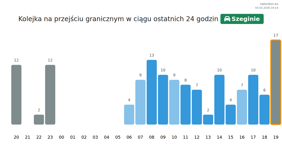 Na przejściu Szeginie, czas oczekiwania dla aut: 15-117 minut (średnio 62 minuty). Unikaj godzin szczytu: 12:00, 17:00, 10:00. Najlepsze godziny to: 01:00, 02:00, 05:00.