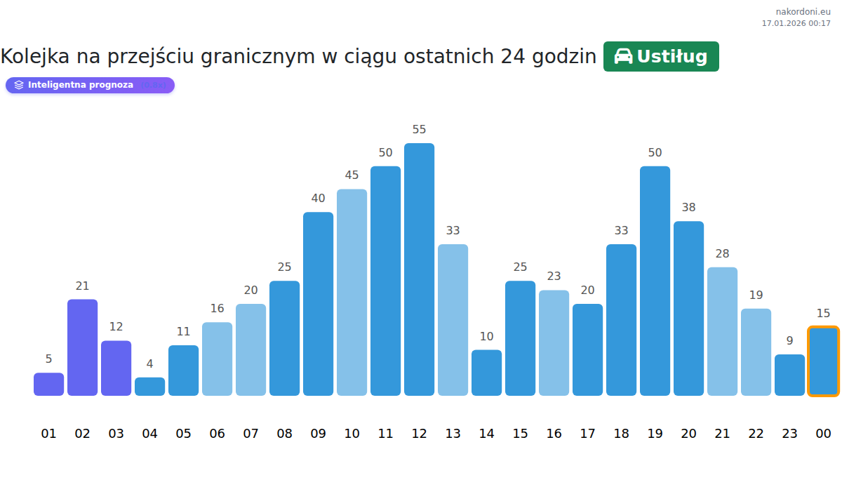 Na przejściu Ustiług czas oczekiwania wynosi 43–147 minut. Unikaj godzin szczytu o 20:00, 21:00 i 18:00. Najlepiej zaplanować podróż na 23:00, 01:00 lub 03:00.