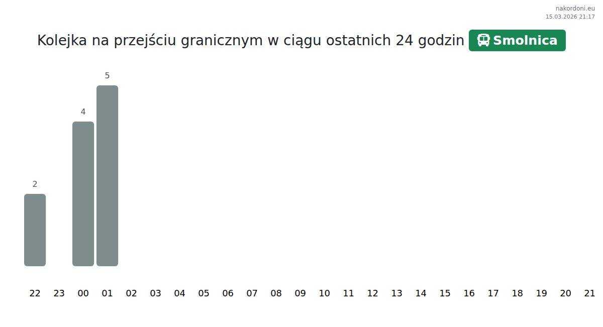 Czas oczekiwania w Smolnicy waha się od 15 do 575 minut. Godziny szczytu to 02:00, 22:00 i 14:00. Najlepiej zaplanować podróż na 00:00, 05:00 lub 06:00, kiedy kolejki są najkrótsze.
