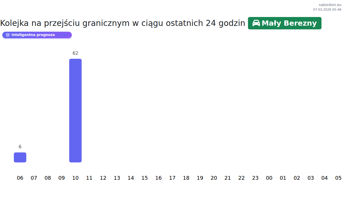 Na przejściu granicznym Mały Berezny prognozowany czas oczekiwania dla samochodów osobowych to 15-165 minut. Unikaj godzin szczytu: 23:00, 22:00, 17:00. Najkrótsze kolejki spodziewane są około 00:00, 02:00 i 05:00.