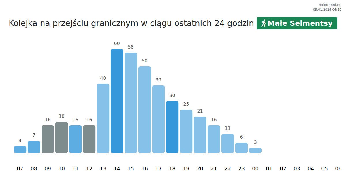 Planuj swoje podróże z wyprzedzeniem, korzystając z aktualnych informacji o kolejkach na granicy na punkcie kontrolnym Małe Selmentsy - pieszy, aby przejazd był szybki i wygodny. Zwróć szczególną uwagę na te godziny, aby uniknąć szczytowego natężenia i skrócić czas oczekiwania.
