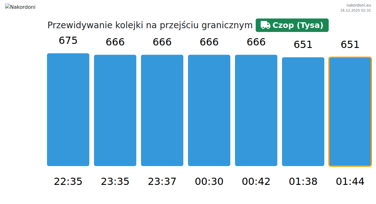Planuj swoje podróże z wyprzedzeniem, korzystając z aktualnych informacji o kolejkach na granicy na punkcie kontrolnym Czop (Tysa) - transport ciężarowy, aby przejazd był szybki i wygodny. Zwróć szczególną uwagę na te godziny, aby uniknąć szczytowego natężenia i skrócić czas oczekiwania.
