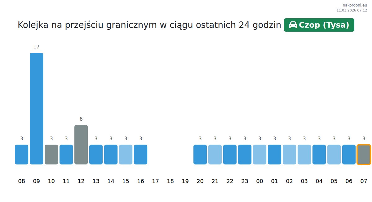 Na Czop (Tysa) czasy oczekiwania wynoszą od 15 do 441 minut. Unikaj godzin szczytu: 02:00, 11:00 i 14:00. Najlepsze godziny z najkrótszymi kolejkami to 03:00, 04:00 i 06:00.