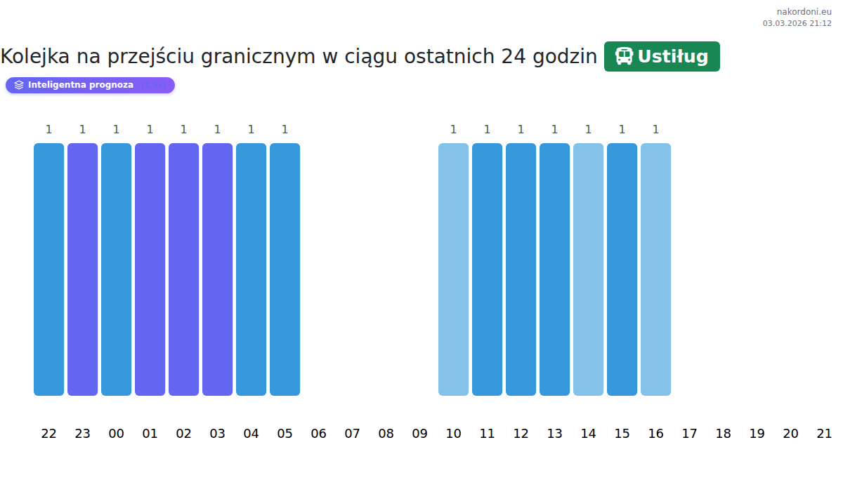 Szacowany czas oczekiwania na przejściu Ustiług wynosi od 15 do 175 minut. Aby uniknąć długich kolejek, zaleca się omijanie godzin szczytu o 21:00, 22:00 i 03:00. Najlepsze godziny na przekroczenie granicy to 05:00, 09:00 i 15:00.