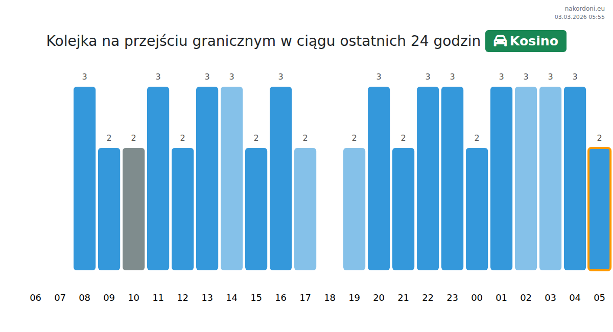 Na przejściu granicznym Kosino, czas oczekiwania dla samochodów osobowych wynosi od 15 do 249 minut, średnio 39 minut. Unikaj godzin szczytu: 16:00, 03:00, 17:00. Najkrótsze kolejki spodziewane są o 23:00, 00:00 i 01:00.