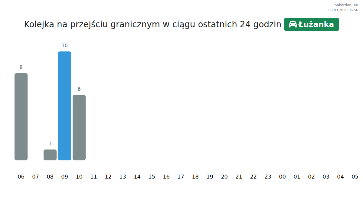 Na przejściu granicznym Łużanka, szacowany czas oczekiwania dla samochodów osobowych wynosi od 15 do 81 minut. Aby zminimalizować opóźnienia, unikaj godzin szczytu o 04:00, 14:00 i 13:00. Najkrótsze kolejki spodziewane są o 00:00, 05:00 i 09:00.
