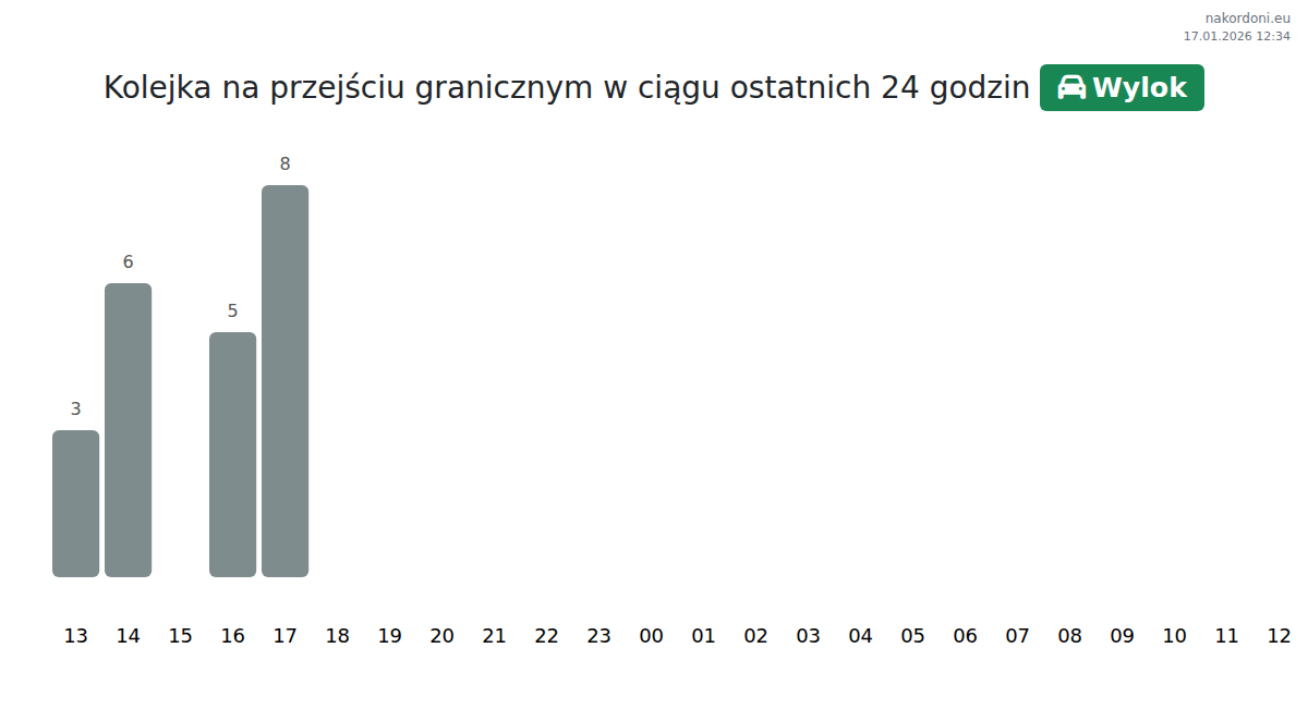 Na przejściu Wylok czas oczekiwania dla aut osobowych wynosi 15-81 min. Godziny szczytu to 04:00, 22:00 i 13:00. Najlepiej planować podróż na 23:00, 00:00 lub 01:00.