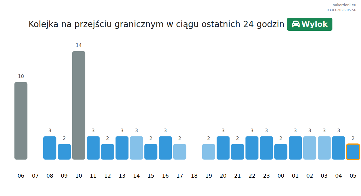 Planuj swoje podróże z wyprzedzeniem, korzystając z aktualnych informacji o kolejkach na granicy na punkcie kontrolnym Wylok - samochód osobowy, aby przejazd był szybki i wygodny. Zwróć szczególną uwagę na te godziny, aby uniknąć szczytowego natężenia i skrócić czas oczekiwania.