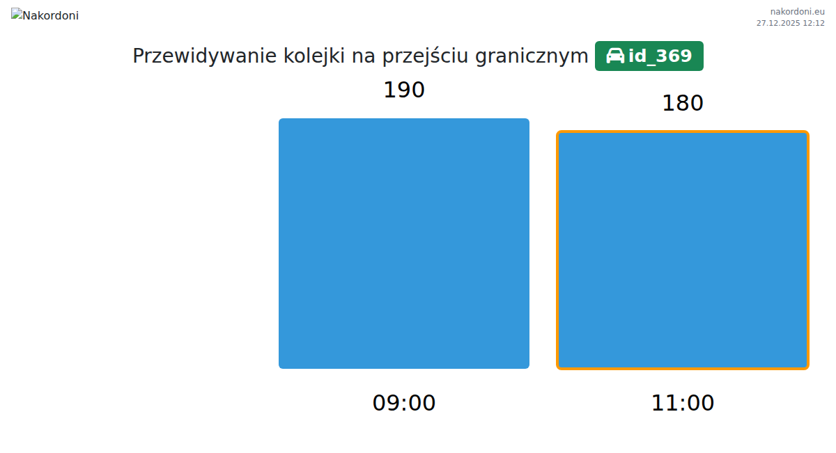 W ciągu kolejki utrzymywały się na stabilnym poziomie, bez znaczących zmian Wieczorne godziny (18:00 - 24:00). Najniższy punkt zaobserwowano o 21:00 27.03.2026 — 335 ciężarówek. Najwyższy punkt zarejestrowano o 18:00 27.03.2026 — 360 ciężarówek.