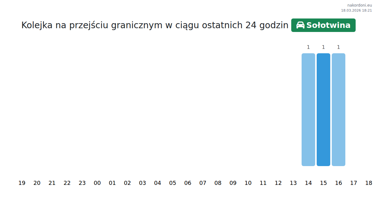 W Sołotwinie czas oczekiwania dla aut osobowych wynosi 15-33 min. Unikaj 13:00, 03:00, 02:00, by uniknąć długich kolejek. Najlepsze godziny na przekroczenie to 15:00, 16:00 i 17:00.