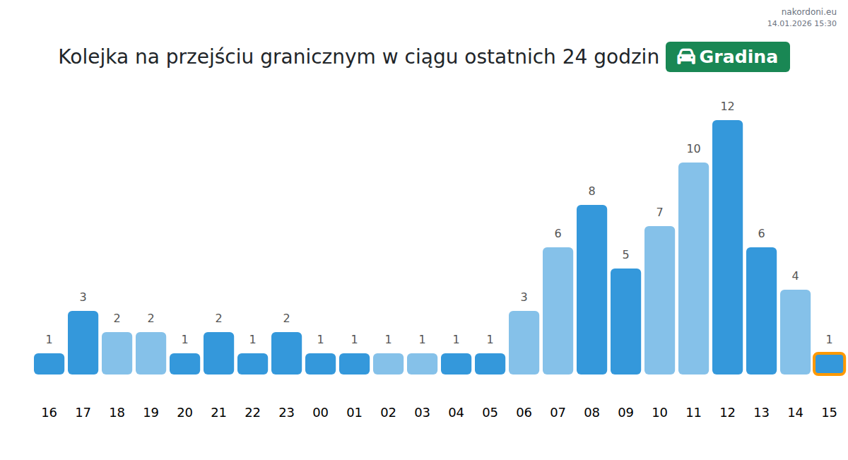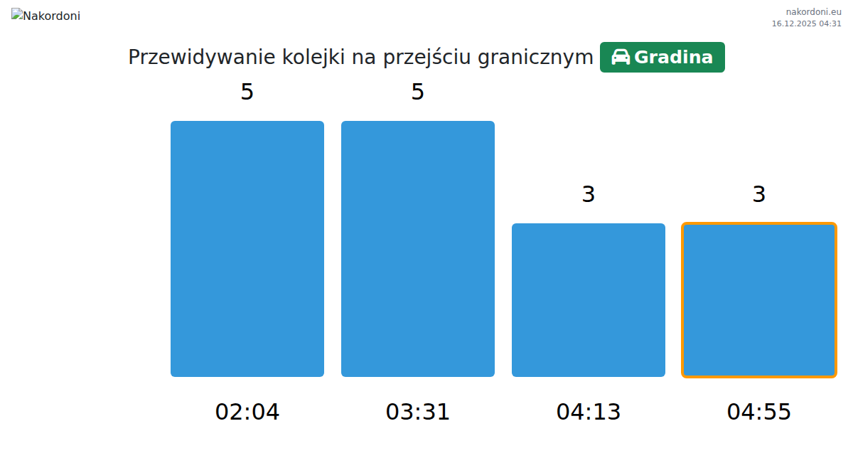 Planuj swoje podróże z wyprzedzeniem, korzystając z aktualnych informacji o kolejkach na granicy na punkcie kontrolnym Gradina - samochód osobowy, aby przejazd był szybki i wygodny. Zwróć szczególną uwagę na te godziny, aby uniknąć szczytowego natężenia i skrócić czas oczekiwania.