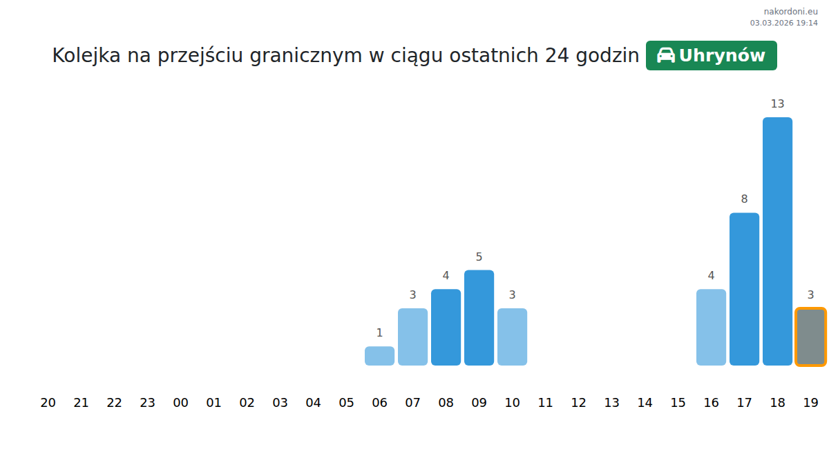 Na przejściu granicznym Uhrynów czas oczekiwania dla samochodów osobowych wynosi od 15 do 75 minut, średnio 33 minuty. Unikaj przekraczania granicy w godzinach szczytu: 23:00, 10:00 i 14:00. Najlepsze godziny na przekroczenie z krótszymi kolejkami to 15:00, 18:00 i 21:00.