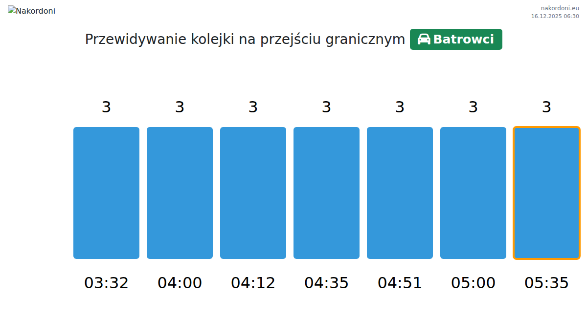Planuj swoje podróże z wyprzedzeniem, korzystając z aktualnych informacji o kolejkach na granicy na punkcie kontrolnym Batrowci - samochód osobowy, aby przejazd był szybki i wygodny. Zwróć szczególną uwagę na te godziny, aby uniknąć szczytowego natężenia i skrócić czas oczekiwania.