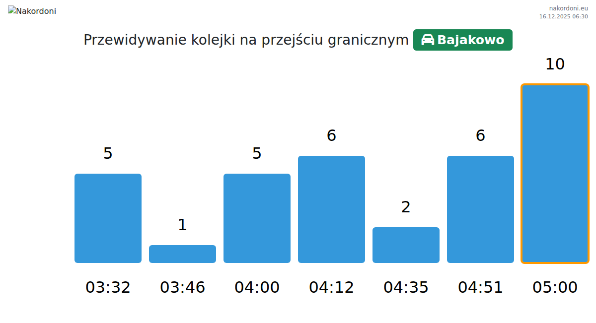 Planuj swoje podróże z wyprzedzeniem, korzystając z aktualnych informacji o kolejkach na granicy na punkcie kontrolnym Bajakowo - samochód osobowy, aby przejazd był szybki i wygodny. Zwróć szczególną uwagę na te godziny, aby uniknąć szczytowego natężenia i skrócić czas oczekiwania.