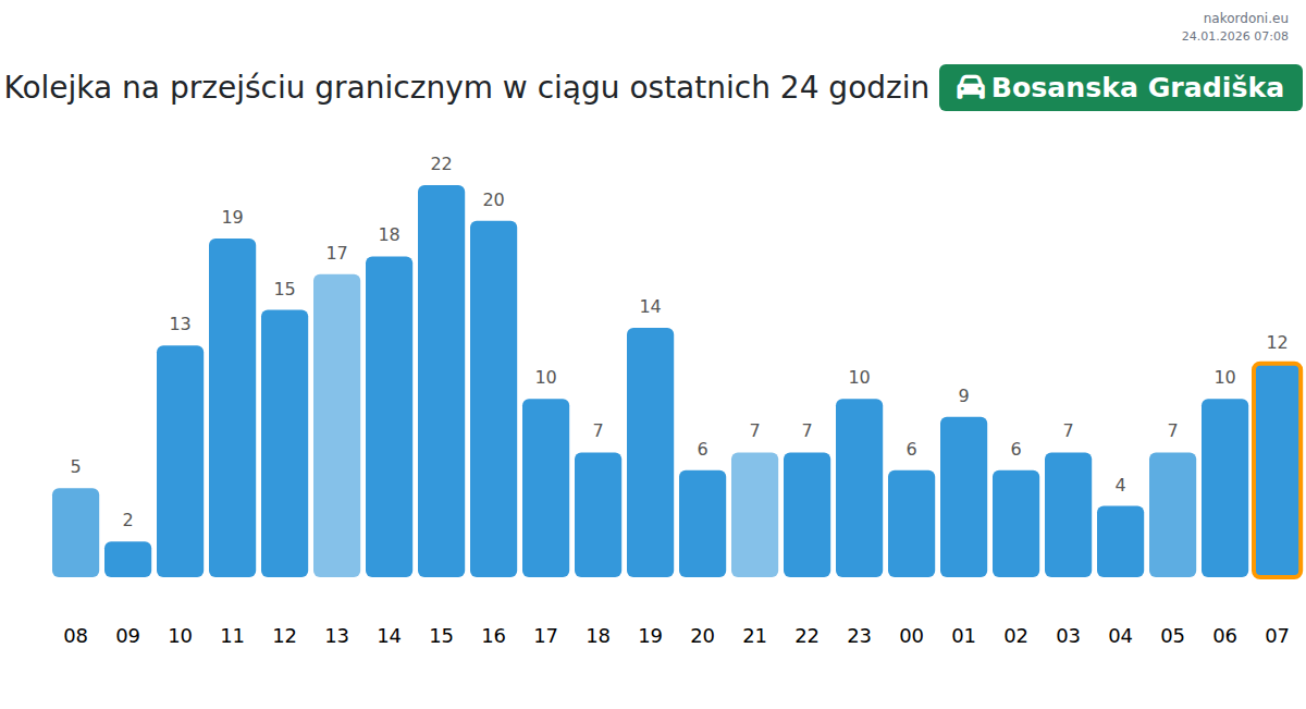 Planuj swoje podróże z wyprzedzeniem, korzystając z aktualnych informacji o kolejkach na granicy na punkcie kontrolnym Bosanska Gradiška - samochód osobowy, aby przejazd był szybki i wygodny. Zwróć szczególną uwagę na te godziny, aby uniknąć szczytowego natężenia i skrócić czas oczekiwania.