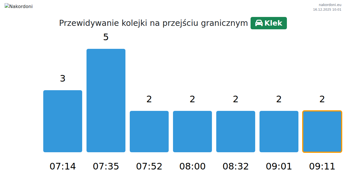 Planuj swoje podróże z wyprzedzeniem, korzystając z aktualnych informacji o kolejkach na granicy na punkcie kontrolnym Klek - samochód osobowy, aby przejazd był szybki i wygodny. Zwróć szczególną uwagę na te godziny, aby uniknąć szczytowego natężenia i skrócić czas oczekiwania.