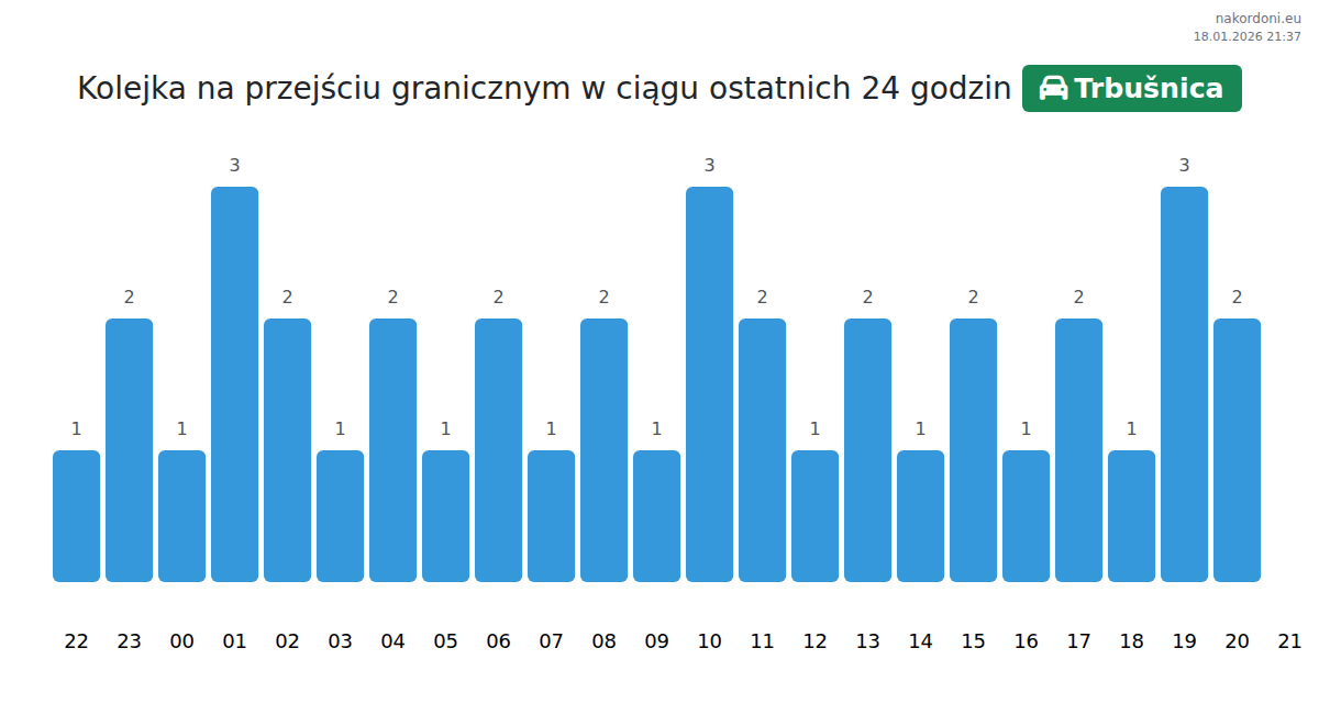 Aby uniknąć długich kolejek na granicy na punkcie kontrolnym Trbušnica - samochód osobowy, zaleca się planowanie przekraczania granicy w godzinach najmniejszego obciążenia. Według danych z ostatniego dnia, najmniejsza liczba pojazdów była obserwowana między 1:00 a 3:00 godziną. To idealny czas na przekroczenie granicy, oszczędzając czas i unikając opóźnień.