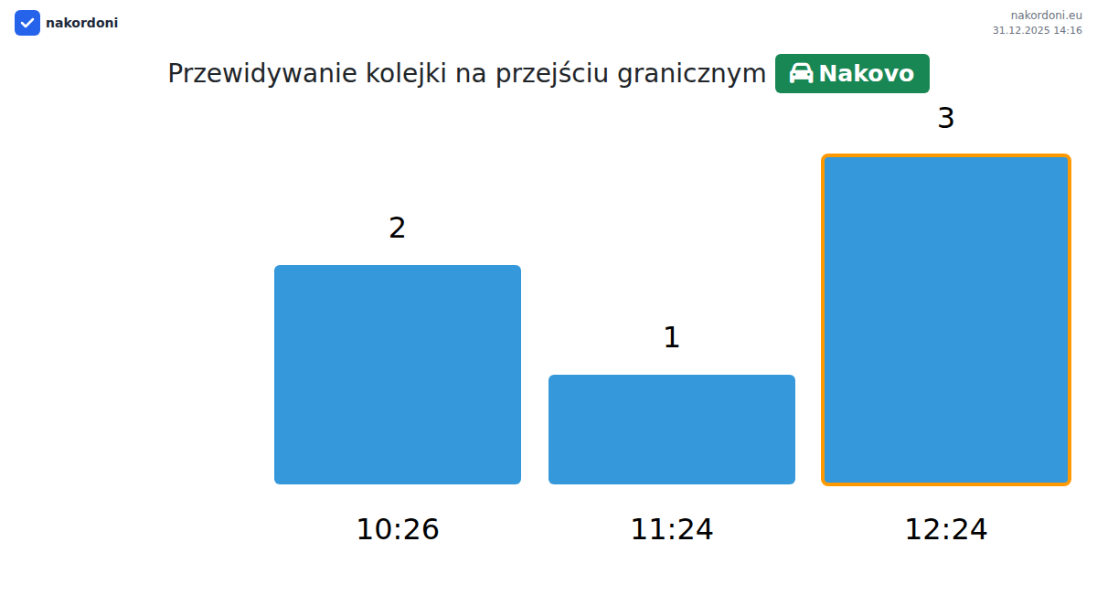 Planuj swoje podróże z wyprzedzeniem, korzystając z aktualnych informacji o kolejkach na granicy na punkcie kontrolnym Nakovo - samochód osobowy, aby przejazd był szybki i wygodny. Zwróć szczególną uwagę na te godziny, aby uniknąć szczytowego natężenia i skrócić czas oczekiwania.